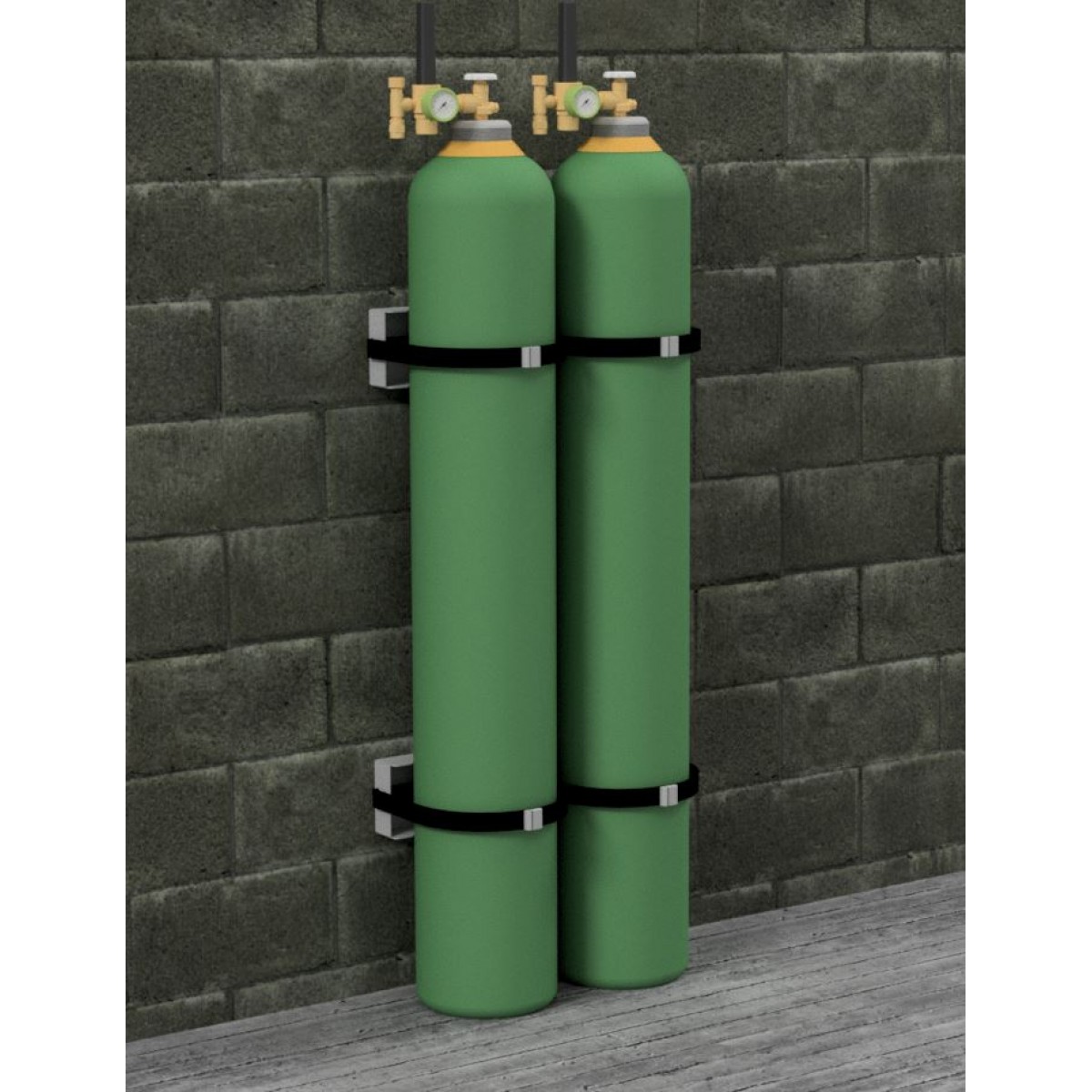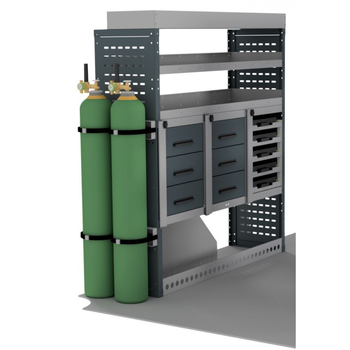 2x Gas Cylinder / bottle holders. Holds up to 2 bottles. (Max Bottle Diameter 205mm). Made from powder coated mild steel, with anti rattle rubber edging. Can be bolted to a suitable van shelving unit or directly to a vehicle side wall or bulkhead.