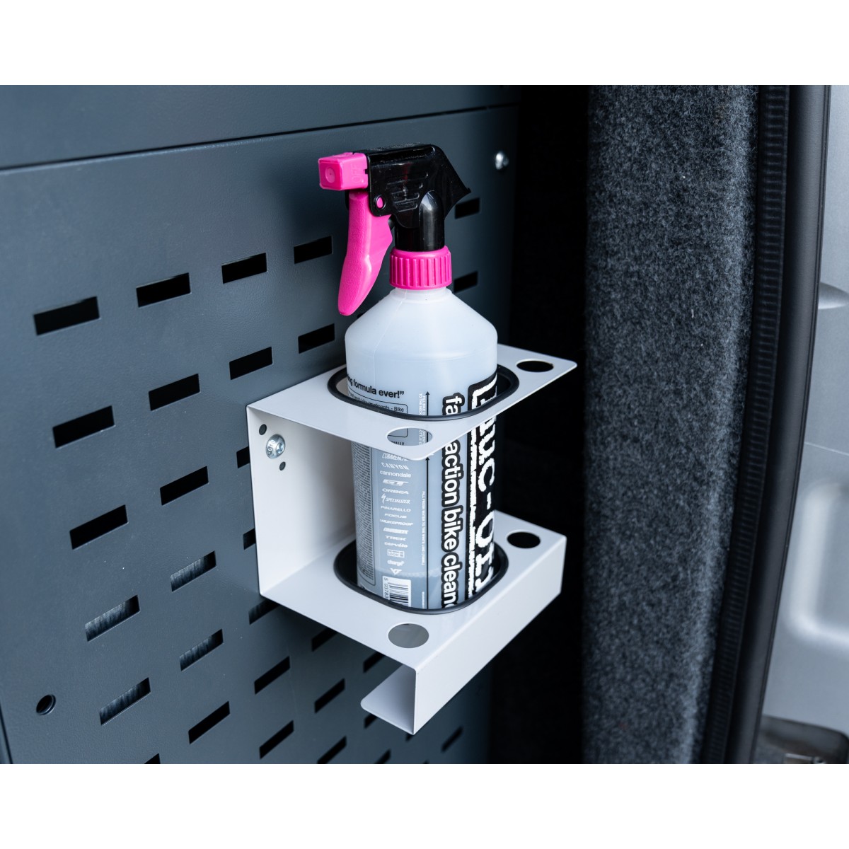 Ideal for mounting on walls in workshops and garages, or on racking and rear doors in vans, it offers versatile storage for tradespeople, detailers, and hobbyists alike. Whether you're on the go or working in your shop, this holder ensures your spray bottles are always within easy reach, making it a practical addition to any setup.