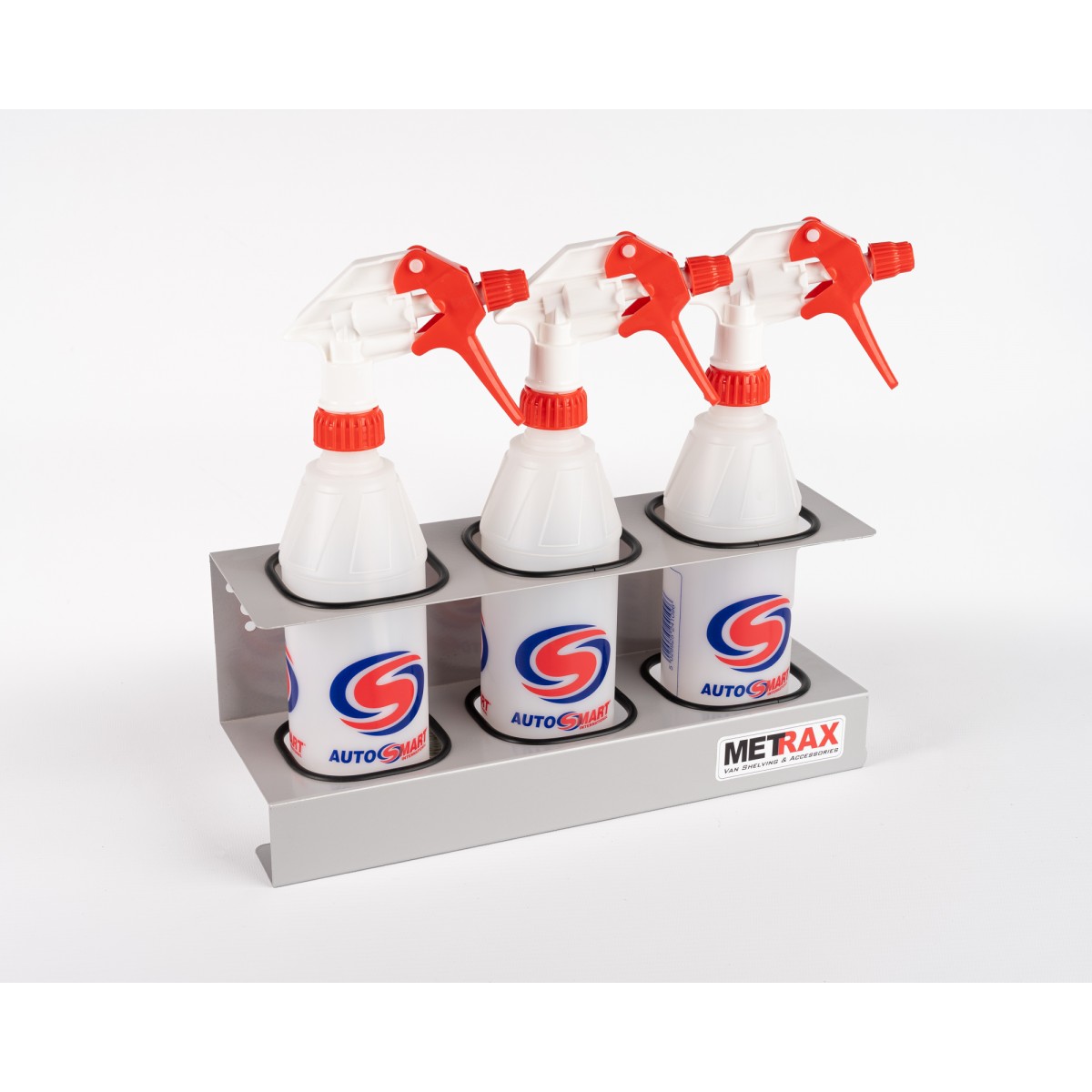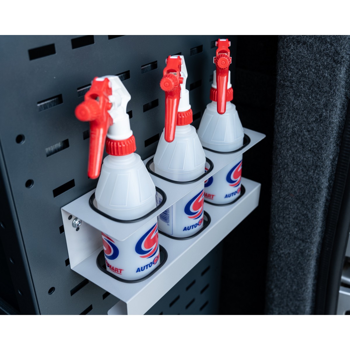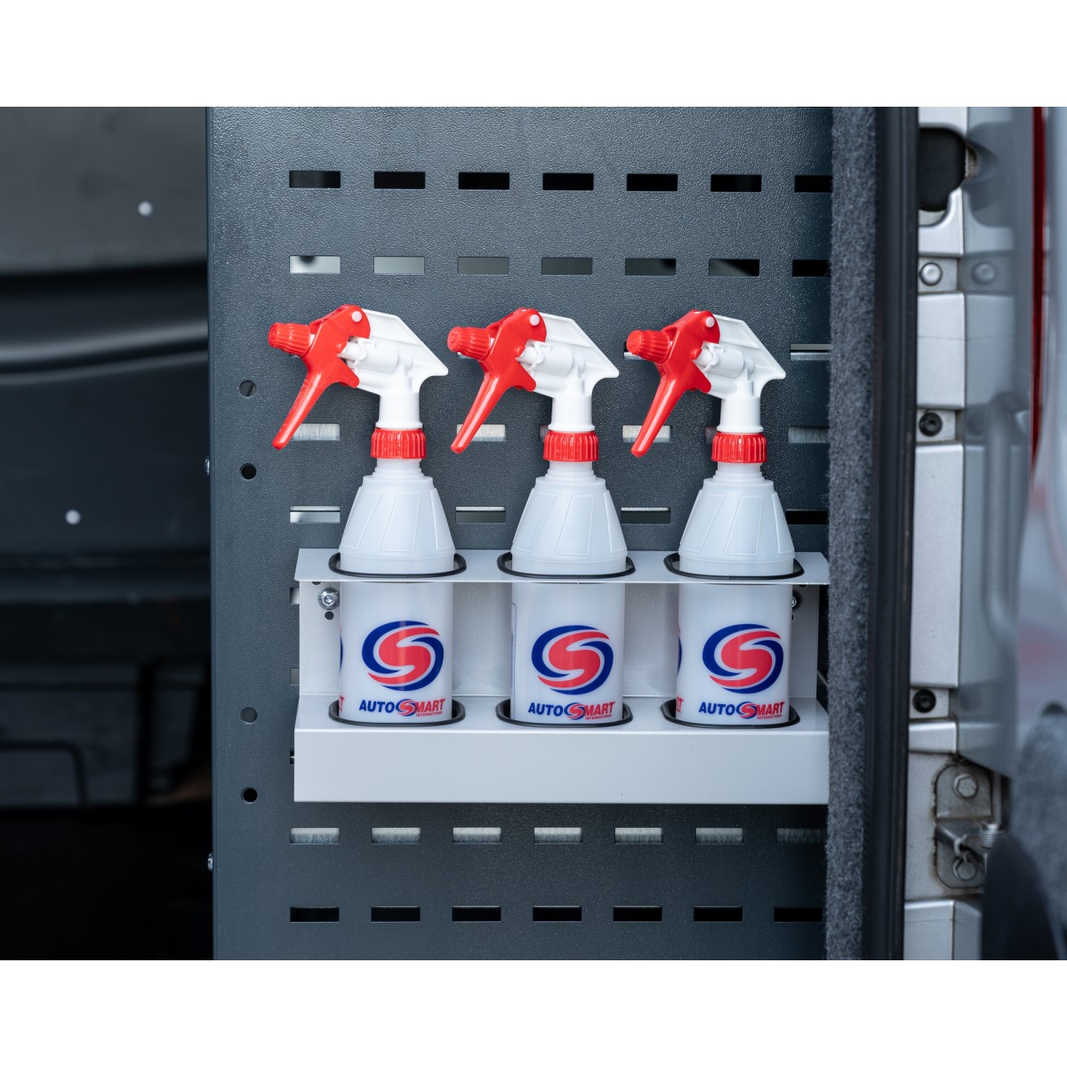 Ideal for mounting on walls in workshops and garages, or on racking and rear doors in vans, it offers versatile storage for tradespeople, detailers, and hobbyists alike. Whether you're on the go or working in your shop, this holder ensures your spray bottles are always within easy reach, making it a practical addition to any setup.