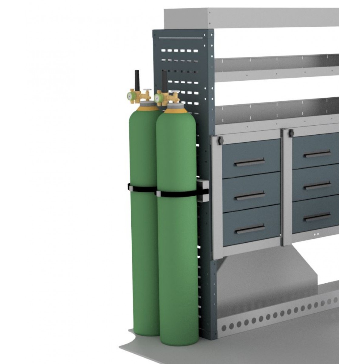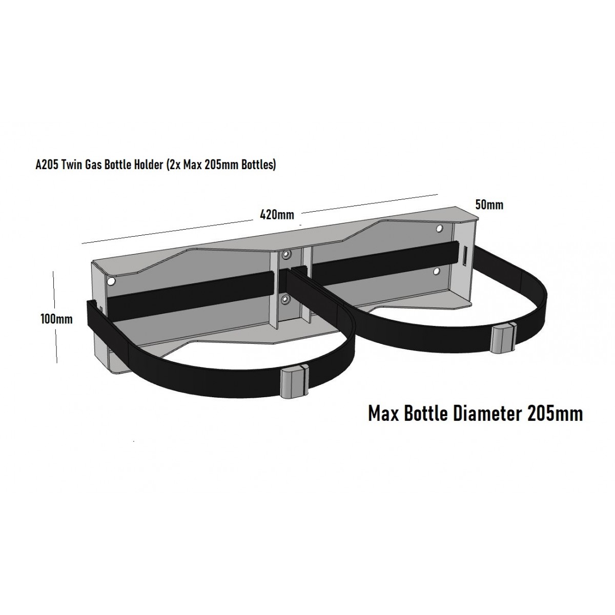 Gas Cylinder / bottle holder. Holds up to 2 bottles. (Max Bottle Diameter 205mm). Made from powder coated mild steel, with anti rattle rubber edging. Can be bolted to a suitable van shelving unit or directly to a vehicle side wall or bulkhead.